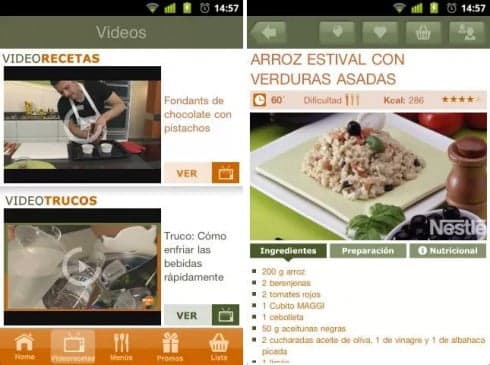 La app de cocina Nestlé Cocina contiene más de mil recetas, video recetas y menús de calidad, garantizados por expertos nutricionistas. Cada día conocerás una nueva receta con la que sorprender a tus seres queridos, y si no te gusta la propuesta, puedes agitar el dispositivo para que te muestre otra receta al azar. También puedes localizar una receta según lo que te apetezca preparar (arroces, carnes, huevos, etcétera) y seguir los pasos que se indican en el modo de preparación. Y si alguna de las recetas te encanta, puedes añadirla a tus favoritos y compartirla con quien quieras.