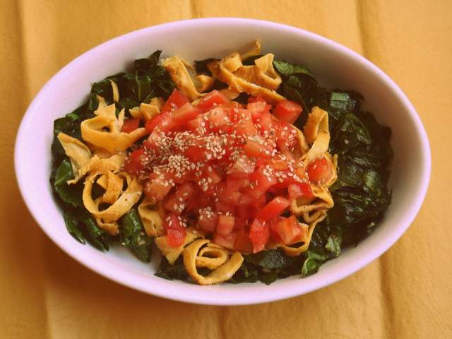 8) Emplatar: poner en el fondo las hojas de brócoli salteadas, en el centro, las tiras de huevo y sobre estas, el tomate en cubos. Salpimentar, condimentar con aceite de oliva y aceto y llover con semillas de sésamo. No saben lo rica que es!