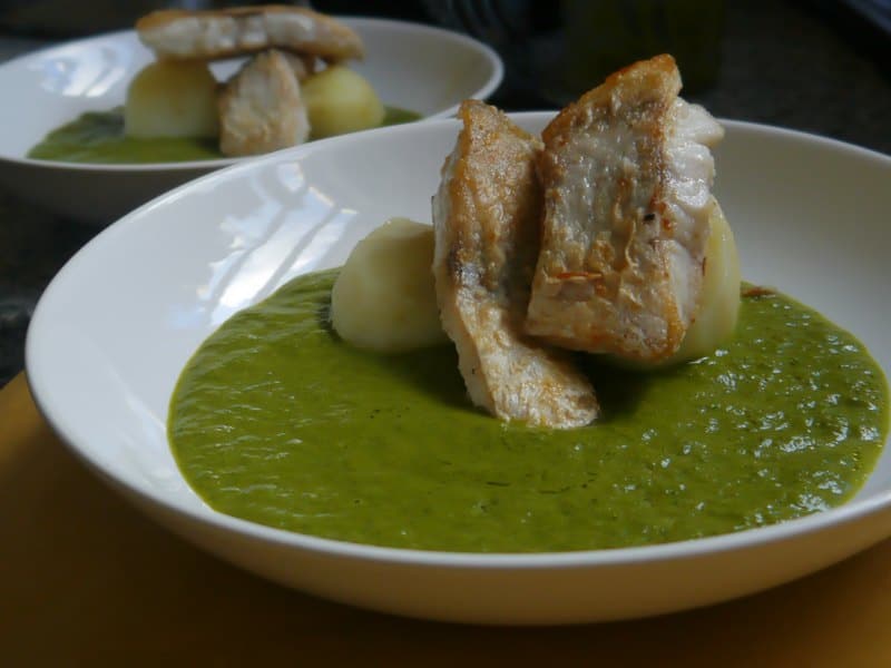 7- ¡Nuestro plato ya está listo! ¡Y es delicioso! sólo nos queda emplatar, para que nos quede bello como su sabor. La idea es hacerlo de la siguiente manera: poner la crema en el fondo, dos trozos de papa en cada plato, y sobre estos, la brótola. De todos modos, este paso pueden hacerlo de la forma que más gusten, pueden innovar o hacer dibujos o lo que deseen. Yo lo hago de esta manera y les puedo asegurar que les va a quedar divino.