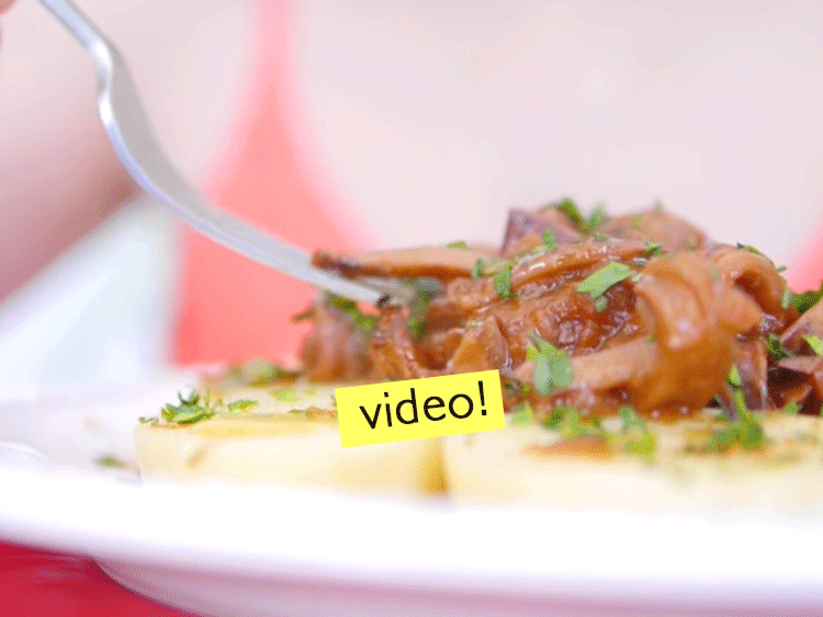 - Para servir nuestro segundo plato de esta cena para dos, vamos a repartir las rodajas de papa entre dos platos, y por encima colocamos las aletas de calamar, podemos espolvorear con un poco de pimentón si quieren, decoramos con perejil picado y estamos!