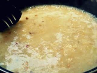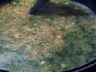 5. Incorporar el caldo y el perejil picado. Remover hasta que quede bien disuelta la harina. La salsa espesará. Cocinar unos minutos más hasta que esté como queramos. Depende de lo que cocinemos, es común poner en esta etapa la carne o pescado en la salsa y que se termine de cocinar así.