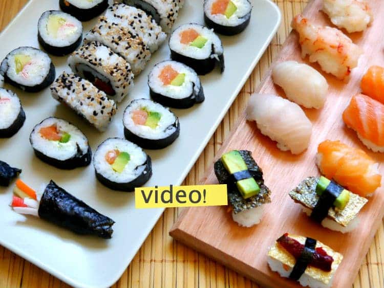 - Armado del sushi: siempre que busques cómo hacer sushi verás lo mismo: el sushi se hace con las manos mojadas. Esto es porque el arroz es súper pegajoso. Hay varios tipos de sushi, les enseño los más comunes. Para ver cómo se arman, háganme el favor de mirarlo en el video, no me hagan a esta altura del año explicar algo tan complejo de decir con palabras.