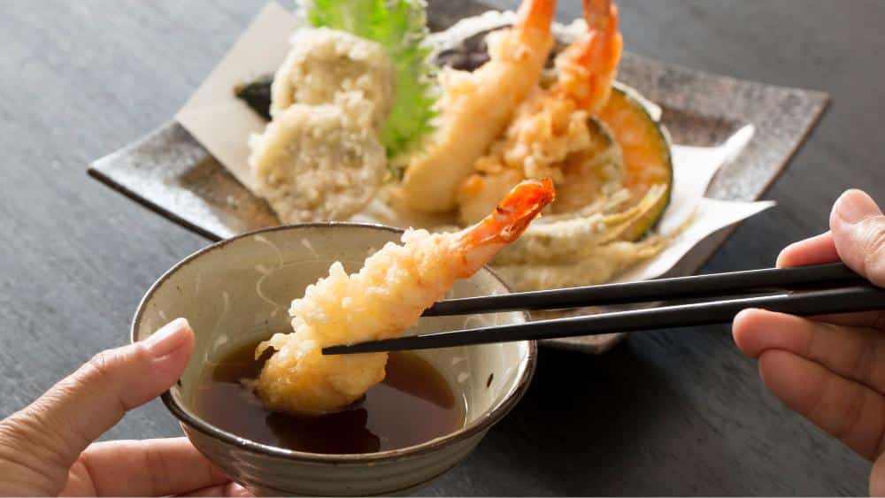 - La tempura se sirve comúnmente con una sal especial llamada “tentsuyu” para mojar. También se puede acompañar con jengibre rallado y rábano picante, que ayudan a realzar los sabores y equilibrar la riqueza de la fritura.