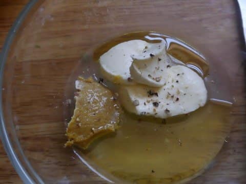 2. Mezclar el limón, la mostaza, el aceite de oliva, la sal, pimienta y el mascarpone. Mezlar bien hasta integrar completamente.