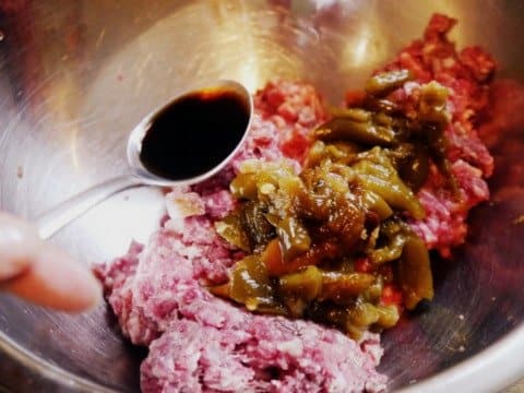 2. Mezclar la carne con la panceta y el humo líquido. Salpimentar y unir bien.
