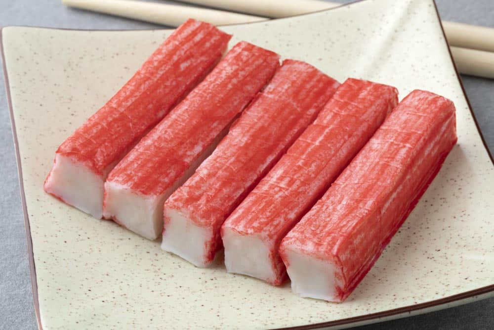 El famoso kanikama o “bastoncitos de cangrejo”, son palitos hechos de surimi o carne de pescado blanco curada, por fuera se ven de color rosado y por dentro blanco.
