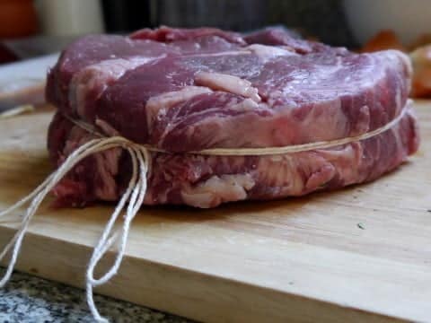 1. Lo primero es atar el ojo de bife por los costados (como se ve en la foto), con hilo de algodón o hilo de cocina. Esto lo hacemos para que no pierda la forma. No está bien perder las formas, chicos, esto ya lo saben.