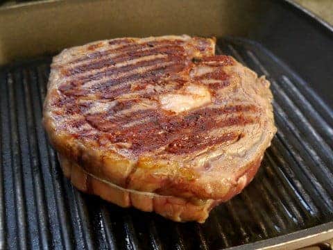 3. Cuando la plancha está bien caliente, ponemos el ojo de bife, cocinándolo unos 3-4 minutos de cada lado. Esto depende del tamaño del ojo de bife que hayas comprado. El mío era grande, pesaría entre 500 y 700 g.