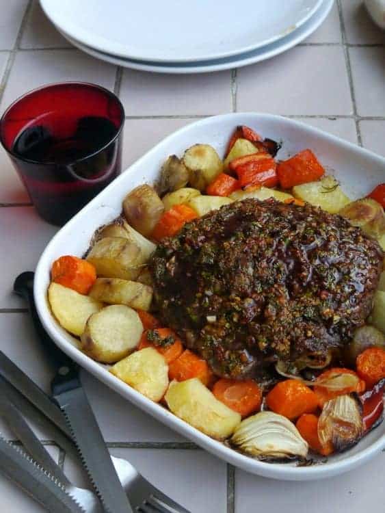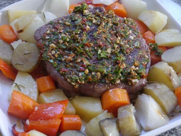 4. Retiramos el ojo de bife de la plancha y lo colocamos en una fuente para horno. En mi caso, la fuente tenía verduras que estaba cocinando desde una media hora antes, de modo que hice un hueco entre las verduras y lo puse en la misma fuente. Colocar por encima el chimichurri (ponele bastante!) y llevar al horno en temperatura medio-alta. Con 10-15 minutos será suficiente.