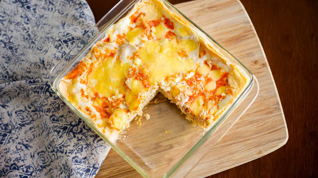 Sobre la capa de carne se agrega otra capa de tortillas. Este proceso se repite varias veces, hasta que se llega a la altura deseada para el pastel. La capa superior debe ser de queso rallado o mozzarella fresca, que se funde y dora en el horno para darle una textura y color típicos del gratinado.