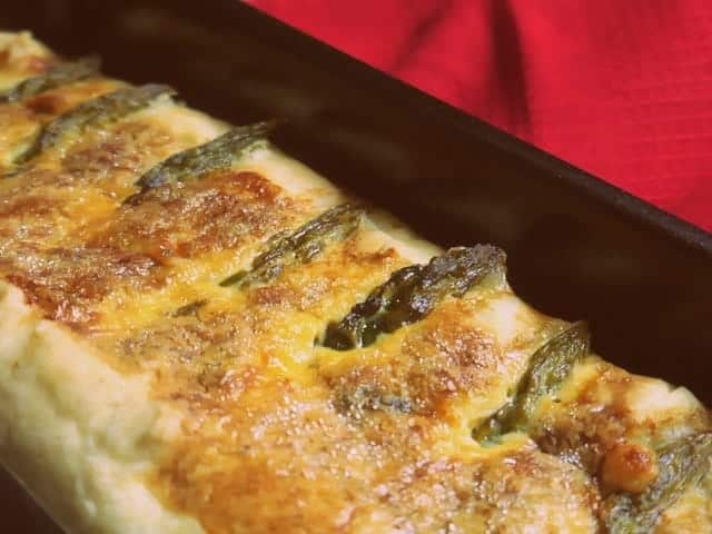 9. Agregar sobre la masa la mitad de la mezcla de espárragos y queso. Colocar los tronquitos de espárragos que habíamos reservado, uno al lado del otro.