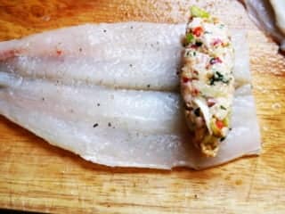 4. Hacer una especie de cañoncitos (?) con el relleno. Colocar en medio de cada pejerrey y enrollar. Yo no los sostuve con nada porque se sostienen bien. Ir colocando en una fuente de horno uno al lado del otro.