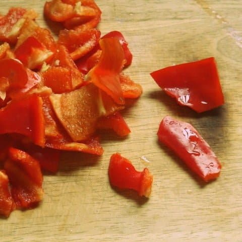 1. Cortar el pimiento en trozos grandes, con las manos, y ponerlo en una sartén con un chorro de aceite de oliva. Saltearlo un par del minutos e incorporar el ajo. Saltear dos o tres minutos más.