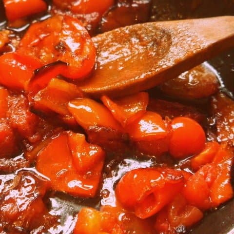 2) Agregar el tomate en cubos (sino, puré de tomates) y saltear hasta que el pimiento esté casi blando… ¡dije casi! Salpmimentar y condimentar con orégano.