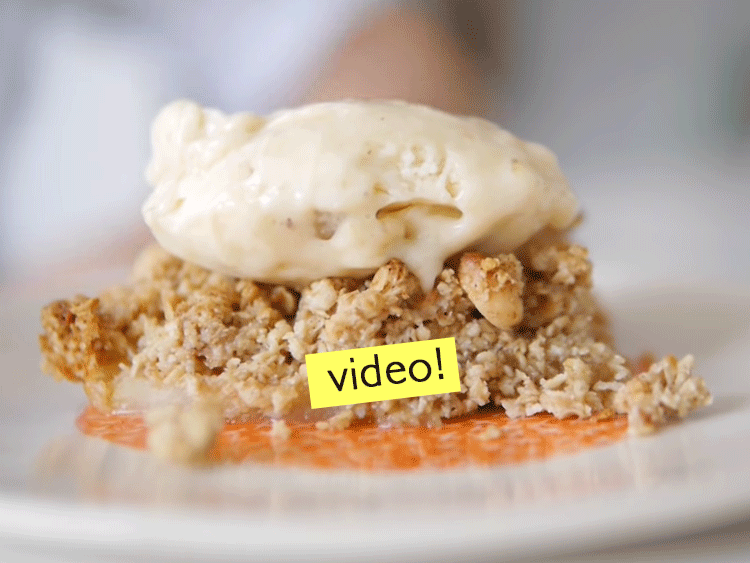 - Antes de servirlo, vamos a procesar los trozos de banana congelados hasta obtener una textura cremosa. Servimos una porción de crumble tibia, con una cucharada de banana frozzen arriba. El mejor postre económico de tu vida.