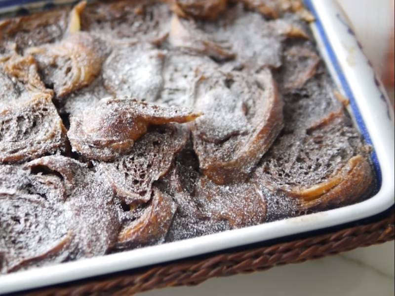 - Ahora sí, lo vamos a llevar a horno suavecito, hasta que se arme como un budín de pan pero de medialunas.
