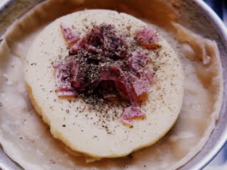 3. Colocar en el centro de esta masa la provoleta, y condimentar con el jamón cortado en tiras, el ajo picado, el orégano y la pimienta negra.