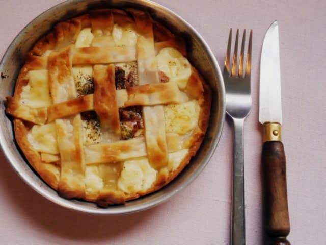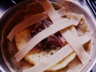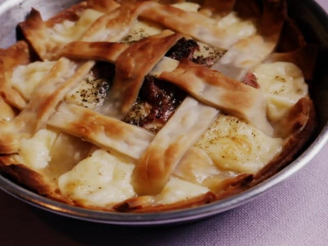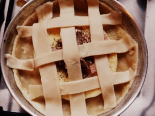 4. Cortar las otras dos tapas de empanadas en tiras gruesas. Intercalar las tiras como lo hacemos con las de la pastafrola, hasta que quede un enrejado.