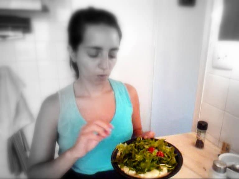 - Colocar la provoleta sobre la montaña de rúcula y, rápido con otro plato, darla vuelta. La provoleta de abajo queda incrustada en la rúcula por el calor del queso.