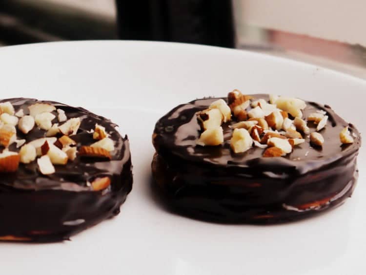3. Derretir el chocolate cobertura a baño maría o en el microondas. Bañar los alfajores por todos lados y llover la parte de arriba con frutos secos picados. Dejar reposar sobre una rejilla (¿quién tiene una rejilla? yo los pongo sobre la tostadora…). ¡Y ya! Tenés lista tu receta de alfajores caseros truchos. A los 5-10 minutos te los podés comer.