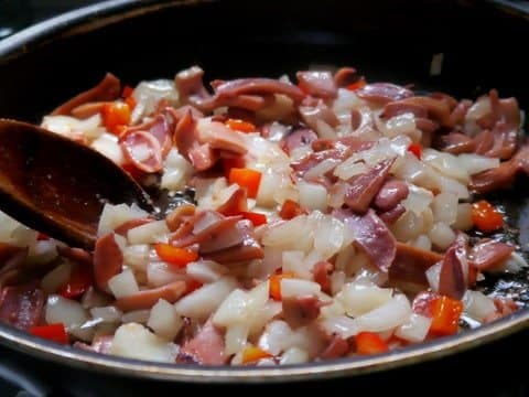 2. Agregar a la sartén (aún con los calamares dentro), la cebolla, el morrón y el ajo picados. Saltear hasta que la cebolla esté transparente.
