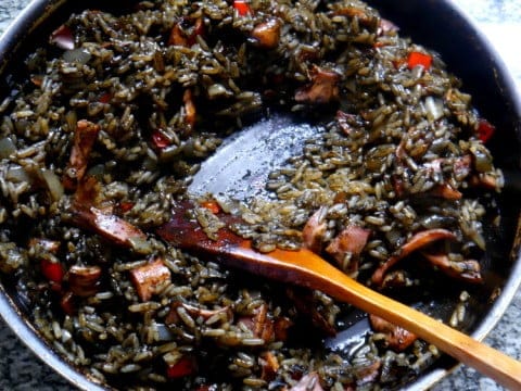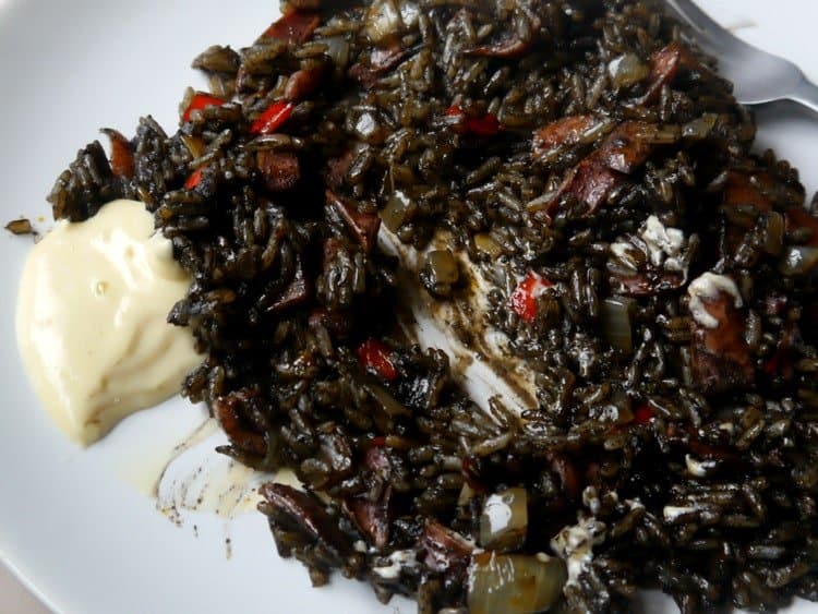 ¿Probaron alguna vez el arroz negro con ali i oli? Es una receta que me encanta, muy típica de la zona de Valencia. En verdad es un arroz bastante simple y similar a un arroz con calamares, solo que está teñido con tinta de calamar (de ahí que arroz negro). A mí me encanta porque tiene un sabor a mar riquísimo. Y la combinación con el all i oli, que a priori me hizo poner carita de sospecha, me parece sencillamente espectacular.