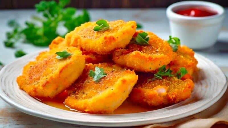 Formar pequeñas porciones en la característica forma de las patitas, empanizarlas y cocinar mediante fritura u horneado para obtener una textura crujiente. Vamos a obtener una receta similar a los boneless de pollo en 4 pasos