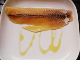 1. En una fuente de horno, poner en el fondo un chorro de aceite de oliva y, sobre éste, el pescado. Salpimentar.