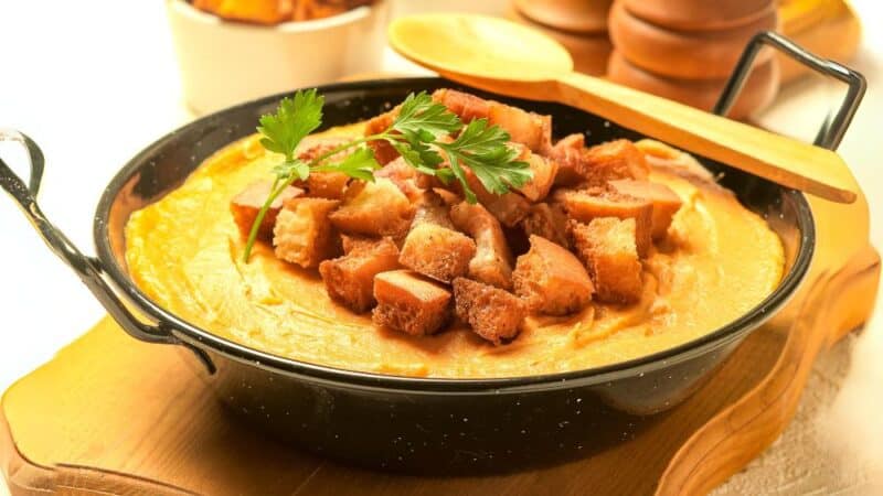 Gachas manchegas, el placer de lo tradicional. Receta fácil con un sabor inigualable y textura cremosa: harina de almortas, con ajo y pimentón.