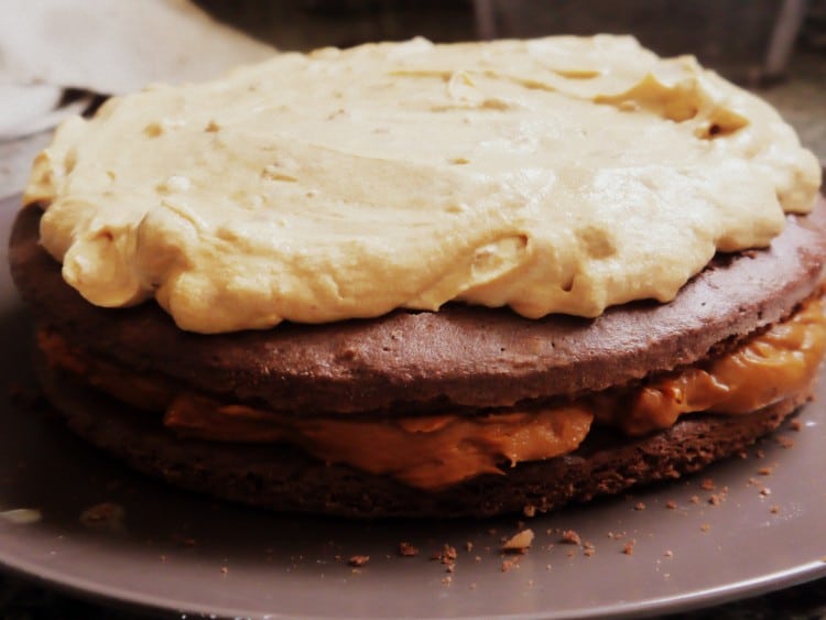 Este es uno de mis rellenos para tortas preferidos: queda del color del chocolate pero con la intensidad del sabor del dulce de leche. Simplemente mezclar el dulce de leche con la mitad de su proporción de manteca pomada y agregar dos cucharadas bien bien panzonas de cacao amargo.