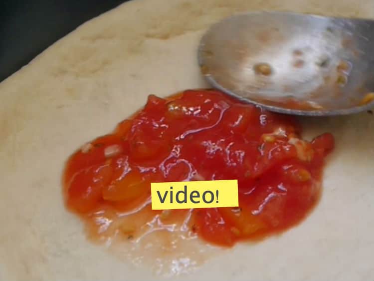 El secreto de esta salsa de tomate para pizza es colocarla sobre la pizza en crudo. De esta manera, el tomate se cocina en el horno junto con la pizza y también quedan, como a mi me gusta, los pedacitos de tomate incrustados en la masa de pizza.