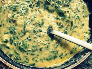 - Picar la cebolla, saltear en un poco de aceite. Cuando estén transparentes, agregar las espinacas picadas. Revolver y saltear por unos 5 minutos.