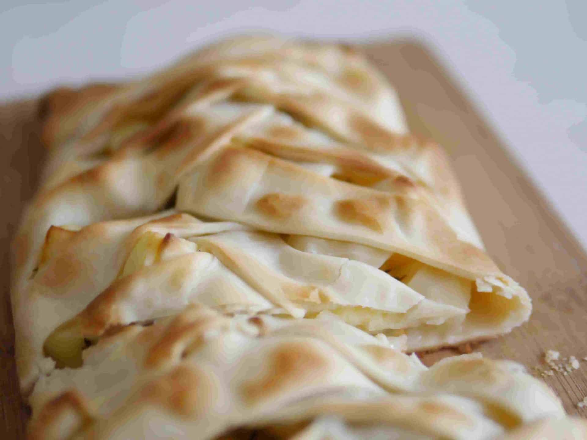 - Desde el centro hacia el borde de la masa. Luego, vamos a tomar de a una de esas tiras y vamos a llevarlas hacia el centro, y colocarlas por encima de nuestro relleno. Una sobre otra, intercaladas, formando una trenza, como las que se hacen en el pelo.