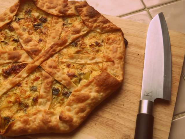 Me aventuré y la hice, reemplazando el puerro (no tenia) por pimiento rojo, y le agregué un toque de Finlandia gruyere. El resultado es ESPECTACULAR. Con la masa casera y todo. Millones de gracias!!! =)