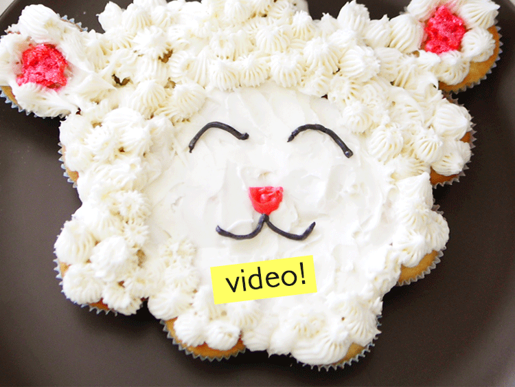 - Con un poco de frosting teñido de negro, vamos a dibujar los ojitos y la boca. Con el mismo frosting pero rosa, decoramos la boca y las orejitas y listo! tenemos nuestra super torta de cupcakes ovejita!!!!